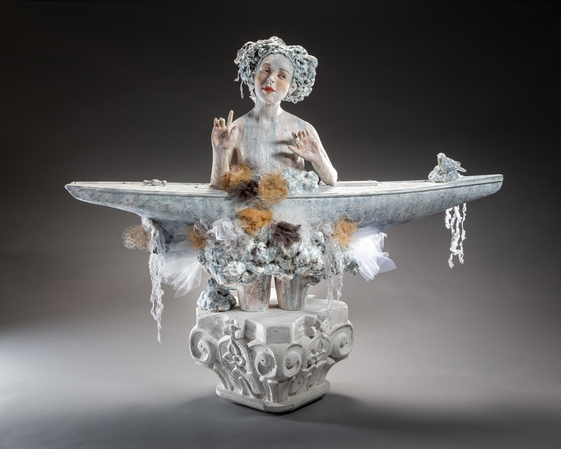 Kirsten Stingle’s narrative sculptures confront a modern paradox: a globally connected world that produces and heightens individual isolation and a superficial understanding of our place in the world. Her work strives to cut through this isolation by highlighting common threads of the human experience through storytelling. Her goal is to create a dialogue with the viewer, encouraging self-revelation and promoting a greater understanding of one another. The primary protagonist in each sculpture is the hand-built porcelain figure, with special emphasis on the communication tools of gesture and expression. Through careful collaboration with other mediums such as fiber, metal, book arts, wood, and basketry, she transforms an intricate mixture of disparate techniques into a seamless narrative vision.