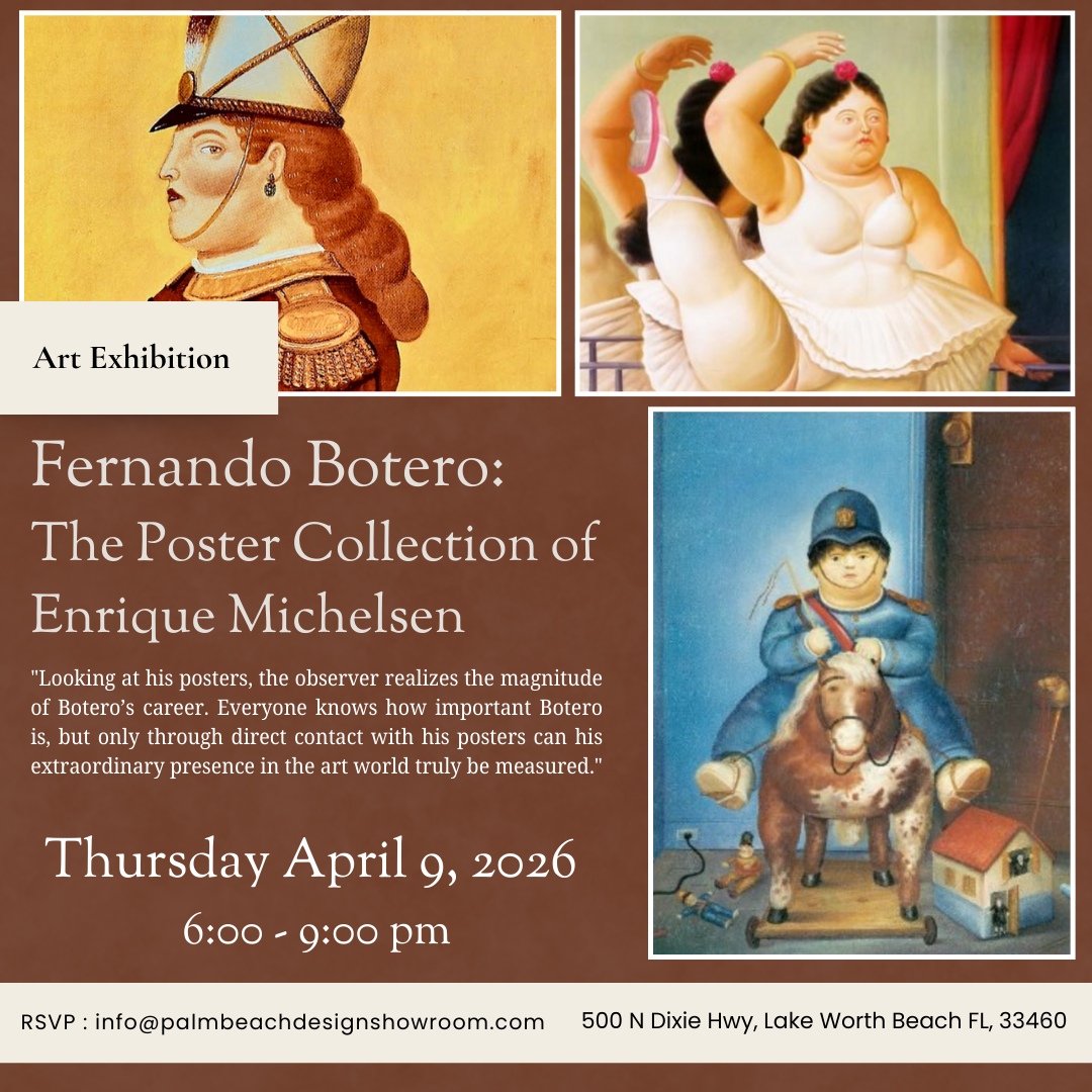 The Palm Beach Art, Antique & Design Showroom and Color Senses Project presents Fernando Botero: The Poster Collection of Enrique Michelsen, an exceptional exhibition featuring a rare archive of posters by the internationally renowned Colombian artist. Collected over decades by Enrique Michelsen, the collection documents Botero’s global influence through posters created for major exhibitions, cultural events, opera, theater, and international festivals. Together, these works offer a unique glimpse into the breadth of Botero’s career and his lasting impact on the international art world.