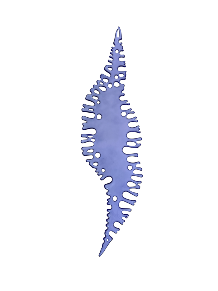 These dimensional fused glass pieces capture the organic beauty of coral formations inspired by Florida’s coastal waters. Each circular sculpture features radiating patterns of flowing voids and solid spaces, creating a delicate interplay of positive and negative space. The carefully orchestrated negative areas—some elongated, some rounded—evoke the natural growth patterns found in corals. Subtle color gradations and surface textures emerge through the 3 separate kiln-forming processes, giving each piece its own unique depth and visual interest. 21″h x 8″ w