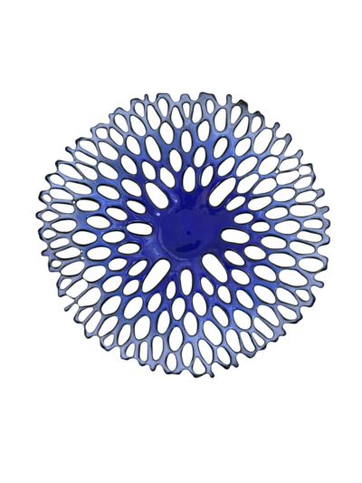 These dimensional fused glass pieces capture the organic beauty of coral formations inspired by Florida’s coastal waters. Each circular sculpture features radiating patterns of flowing voids and solid spaces, creating a delicate interplay of positive and negative space. The carefully orchestrated negative areas—some elongated, some rounded—evoke the natural growth patterns found in corals. Subtle color gradations and surface textures emerge through the 3 separate kiln-forming processes, giving each piece its own unique depth and visual interest. 24″ x 8″