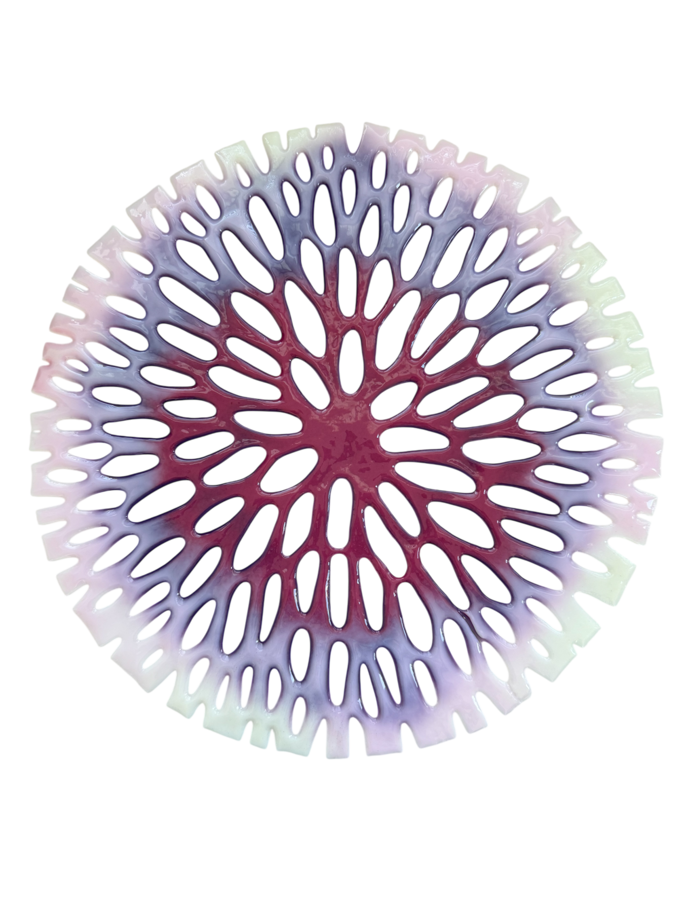 These dimensional fused glass pieces capture the organic beauty of coral formations inspired by Florida’s coastal waters. Each circular sculpture features radiating patterns of flowing voids and solid spaces, creating a delicate interplay of positive and negative space. The carefully orchestrated negative areas—some elongated, some rounded—evoke the natural growth patterns found in corals. Subtle color gradations and surface textures emerge through the 3 separate kiln-forming processes, giving each piece its own unique depth and visual interest. 14″ dia.