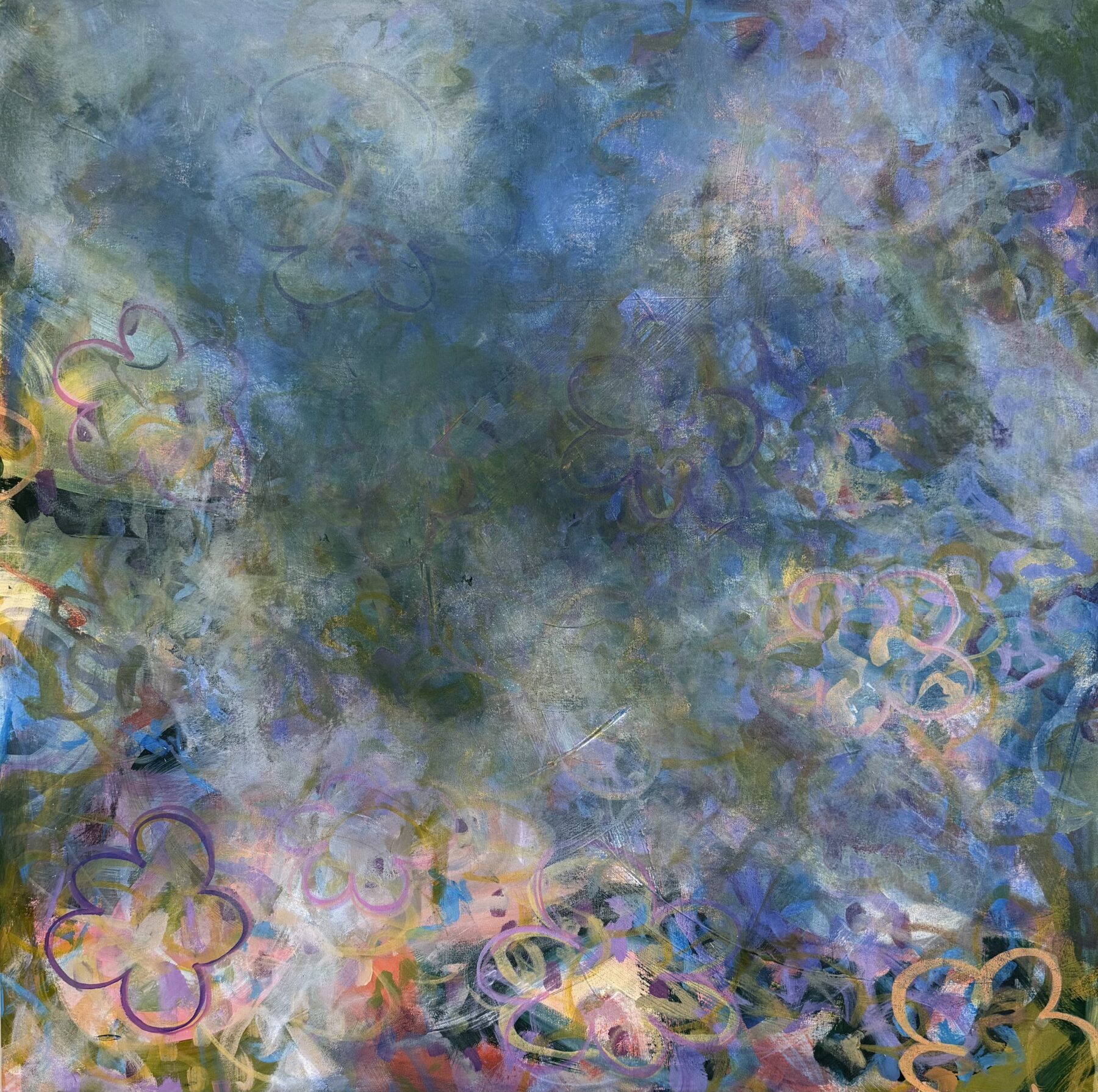 Layers of blue-green move like weather passing through, while delicate floral forms surface and recede. Rather than depicting a literal storm, the painting captures the emotional atmosphere, softened, and quietly reshaping itself.