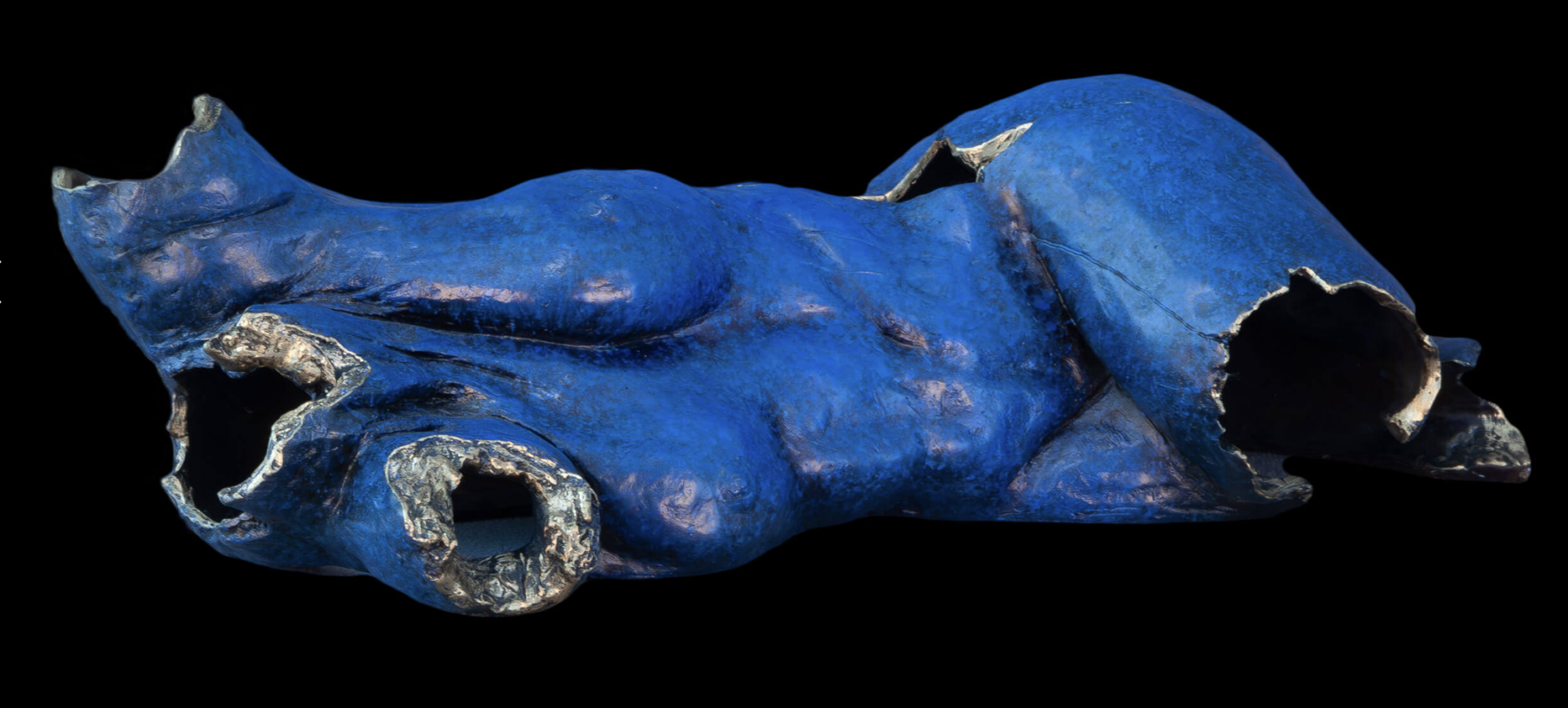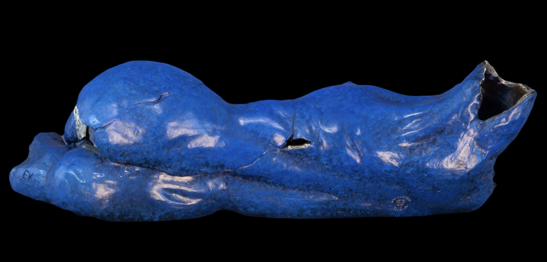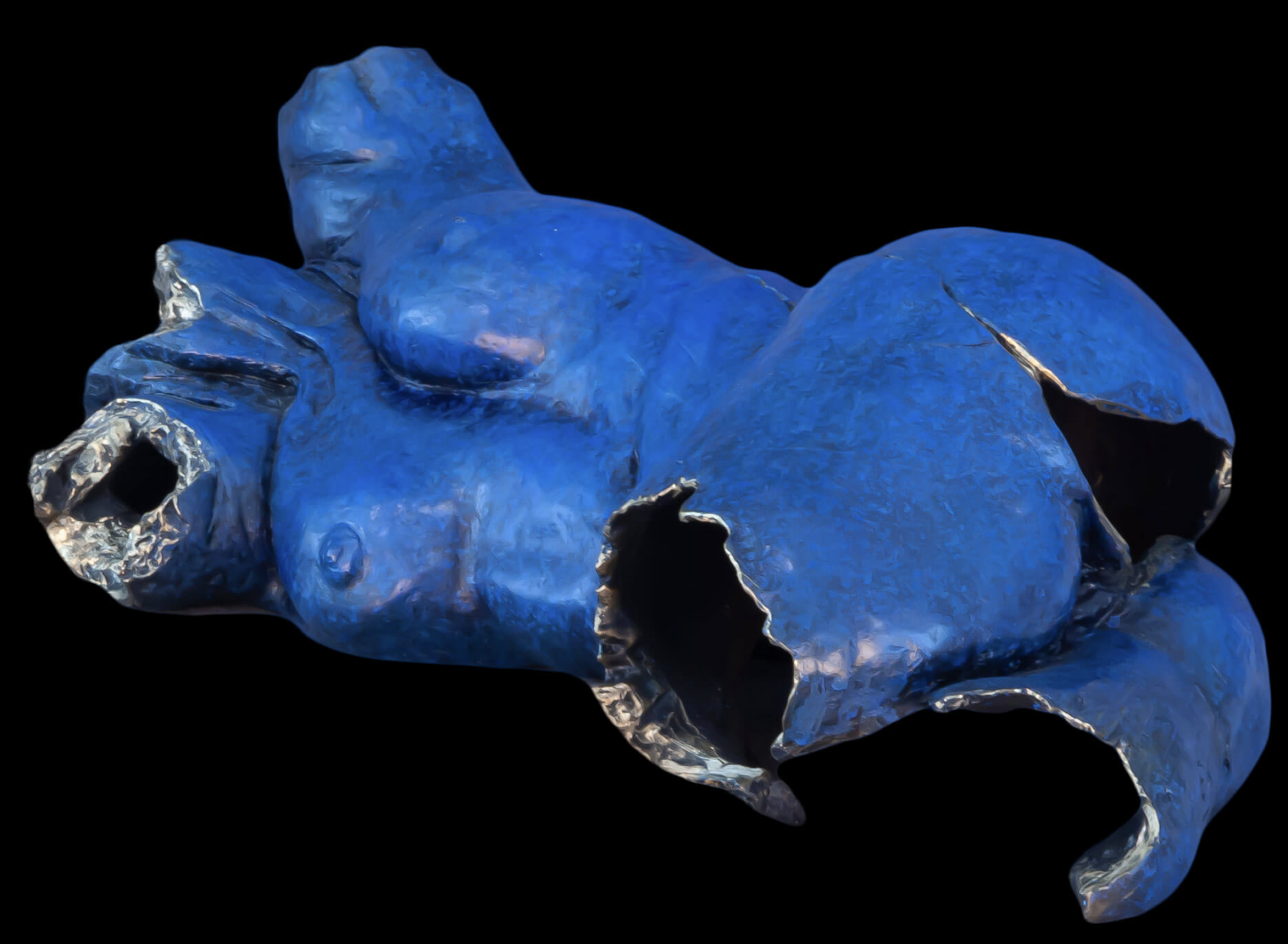 Sublime and delicate, this sculpture portrays the feminine duality between fragility and resilience. The Klein-blue patina highlights the skin’s vulnerability, while the naked metal contours of the cavities point out this bronze’s fundamental solid matter, hidden by its airy appearance. The illusory lightness of the hollow torso seems to epitomize the piece’s fundamental contradictions: unbreakable but broken. In a perfectly achieved representational isolation of the moment, gravity forces shape the twisted woman’s waist modeling her breast with mastery in the hand of the artist. With its textured and complex narrative, Koegler reflects critically on the challenges women face today, achieving a visual grammar filled with emptiness.