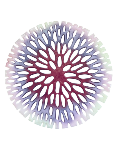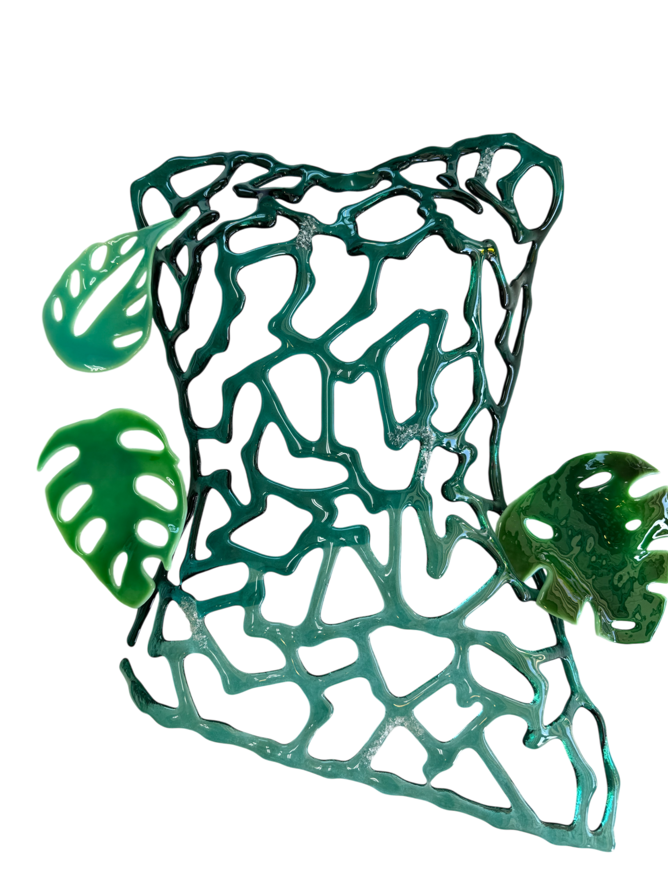 Green Goddess is a luminous fused glass wall sculpture that celebrates organic growth and quiet strength. Flowing networks of transparent teal glass form an open, architectural structure, while layered green elements emerge like leaves caught mid-drift. Light moves effortlessly through the piece, casting subtle shadows and revealing depth, texture, and motion. Both bold and serene, Green Goddess evokes nature’s resilience—wild, elegant, and unapologetically alive. 21″high x 15″w