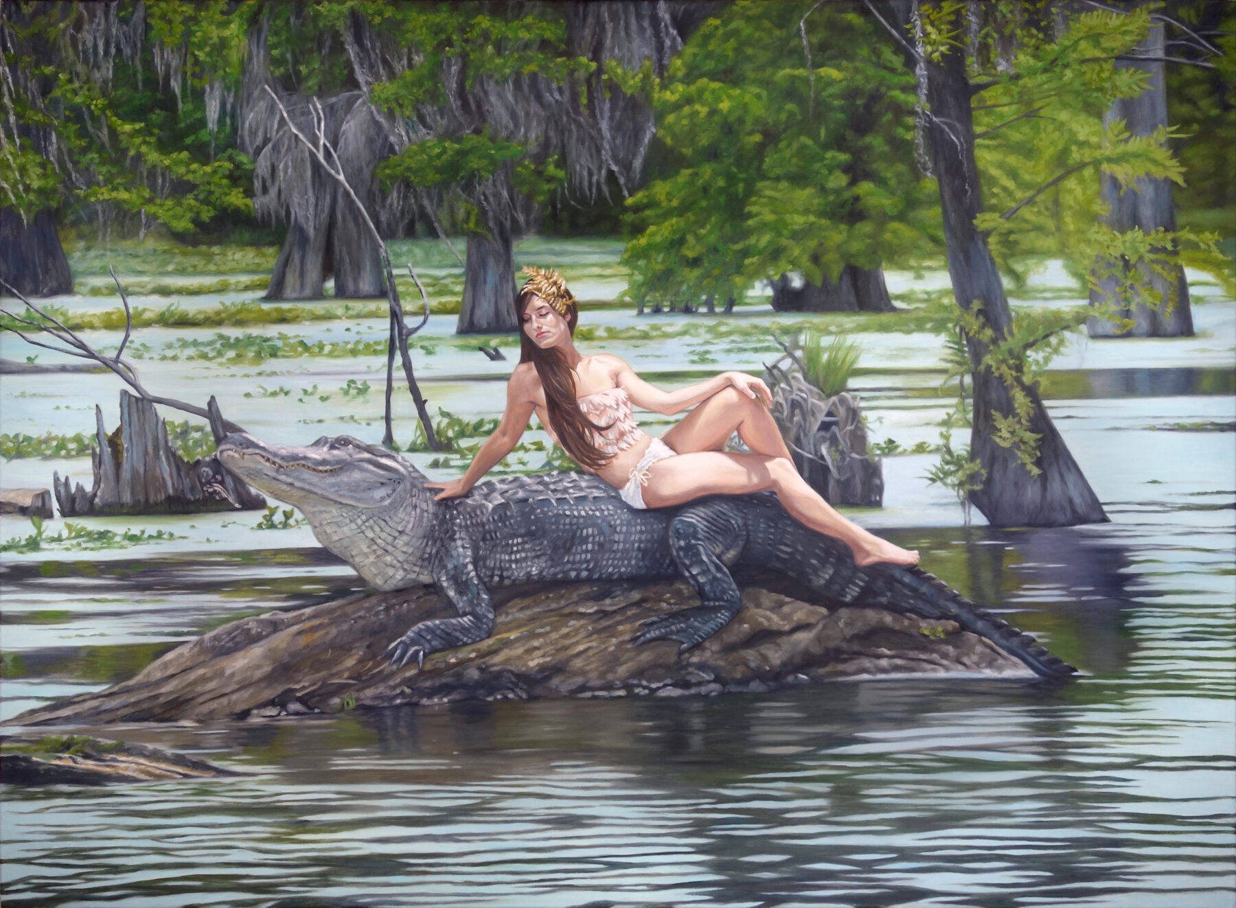 Her paintings frequently feature the flora and fauna of the bayou, such as alligators, nutria, and magnolias, as well as figures inspired by Cajun tales like the rougarou and feu follet.