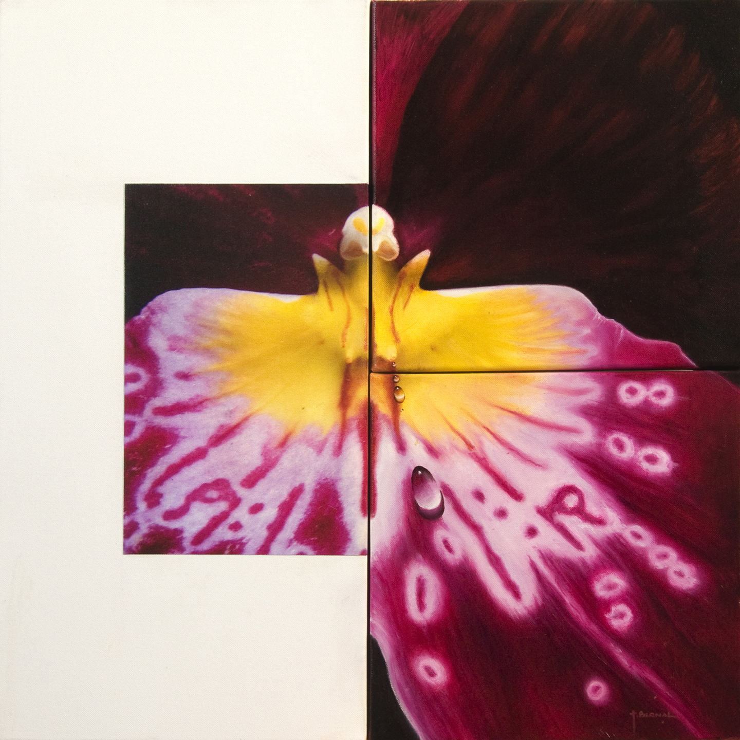 Mixed media image of an orchid, photograph and oil on canvas, Trpitych.