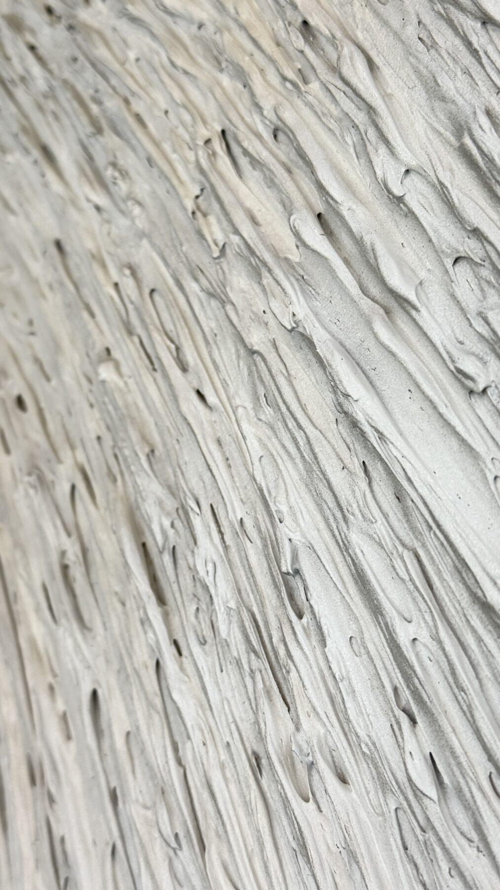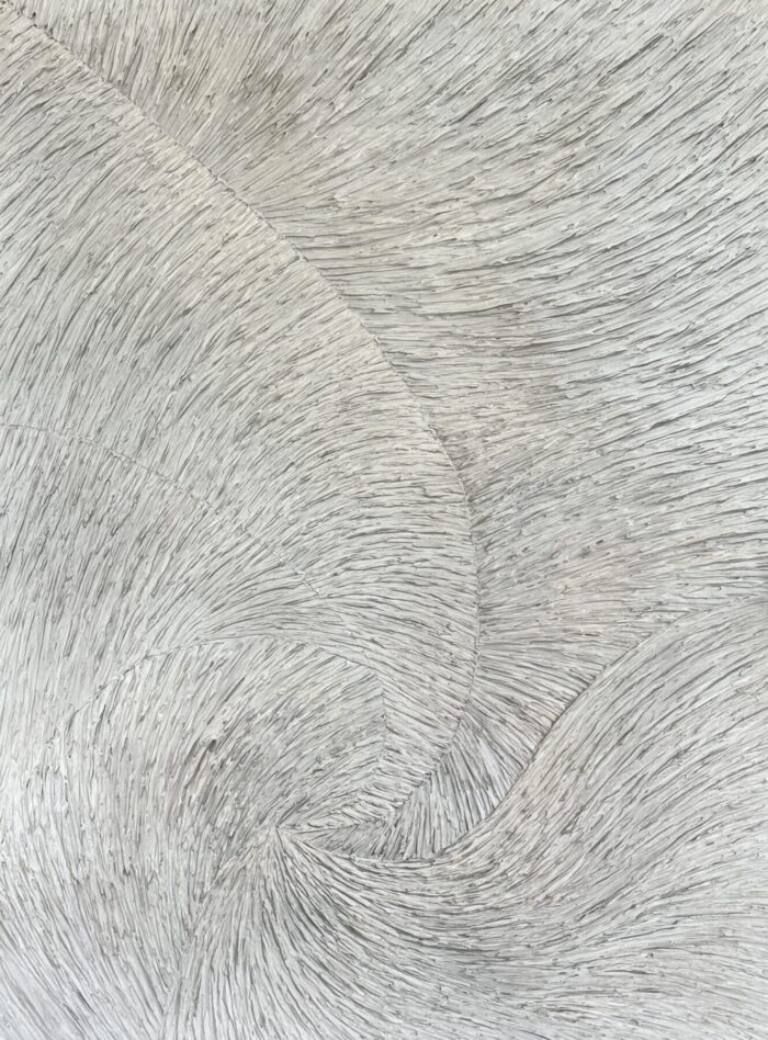 Soft, monochromatic tones and sweeping, carved lines suggest currents of air, water, or energy folding into one another, creating a visual whisper rather than a shout. The textured surface invites slow looking, revealing tiny variations and shifts that echo the way inner emotions ripple under an apparently calm exterior.