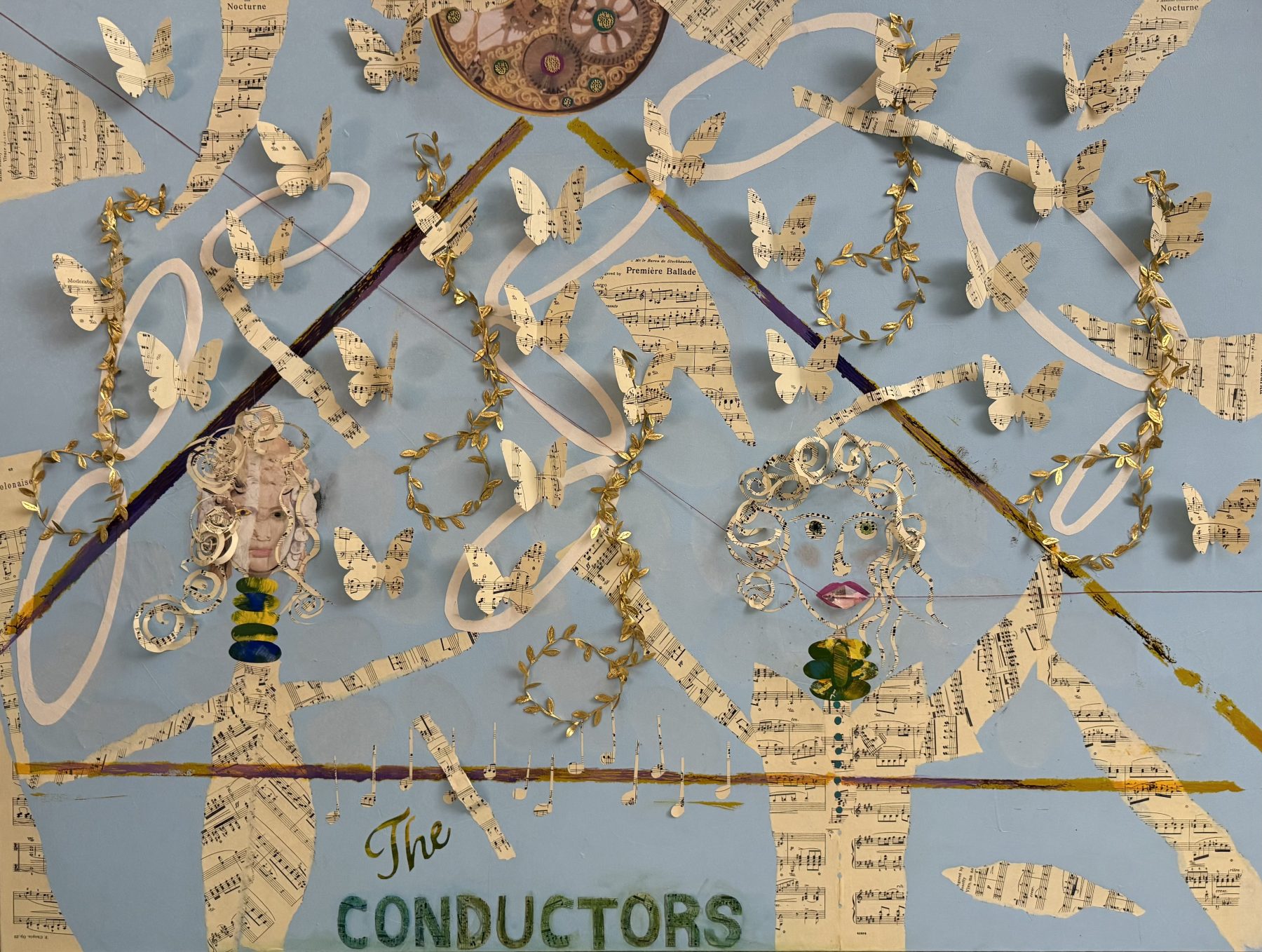 In The Conductors, two ethereal figures orchestrate a visual symphony of motion and sound. Composed of vintage sheet music, gilded vines, and paper butterflies. An artist, like a conductor, channels rhythm, light, and transformation into a unified, lyrical whole.