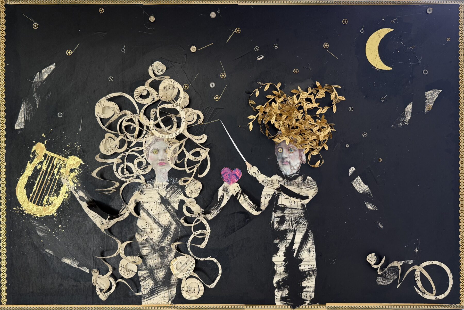 Two figures emerge from darkness — one holding a golden lyre, the other conducting with a wand beneath a crescent moon. Their forms are composed of sheet music. Gold-leaf curls and laurel leaves crown them like constellations in orbit, like music as a cosmic force connecting the human and the divine.