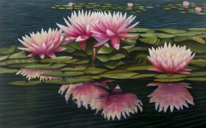Reflections of waterlilies in the water