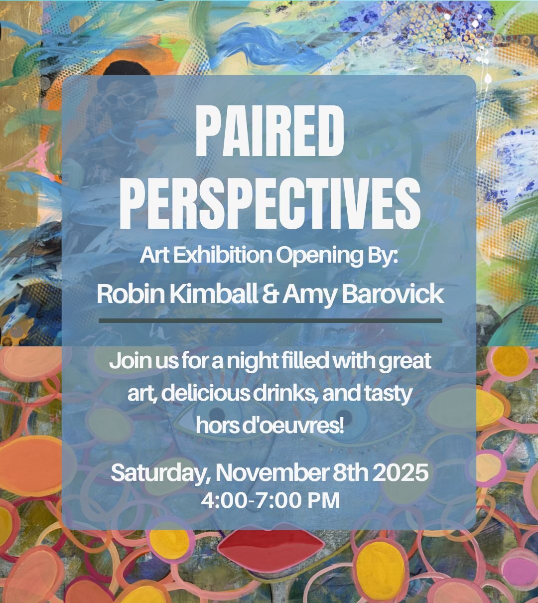 Paired Perspectives unites the distinct visions of Robin Kimball and Amy Barovick, two artists whose approaches to abstraction reveal a shared reverence for color, form, and movement. Robin’s dynamic use of bold hues and expressive brushwork contrasts beautifully with Amy’s refined sense of structure and layered tone. Together, their paintings create a visual rhythm—one that celebrates the conversation between spontaneity and intention, emotion and design. This exhibition is a testament to the power of artistic dialogue and the harmony that emerges when two creative voices meet on the canvas.
